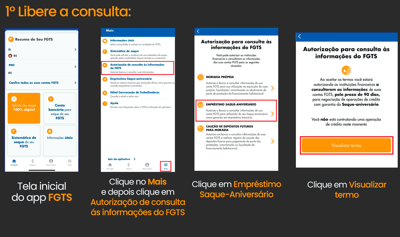 • Limite de valores do saldo passível de antecipação: O limite mínimo é de R$ 100,00 e o máximo é de R$ 500,00 por saque-aniversário. Dessa forma poderá antecipar até cinco parcelas de R$ 500,00, totalizando R$2.500,00.
